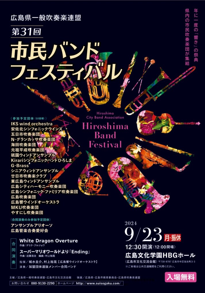 この市民バンドフェスティバルは、広島県内の市民吹奏楽団が集結する大きな演奏会で、演奏会の最後には各団から有志が集まり、合同演奏を行います。