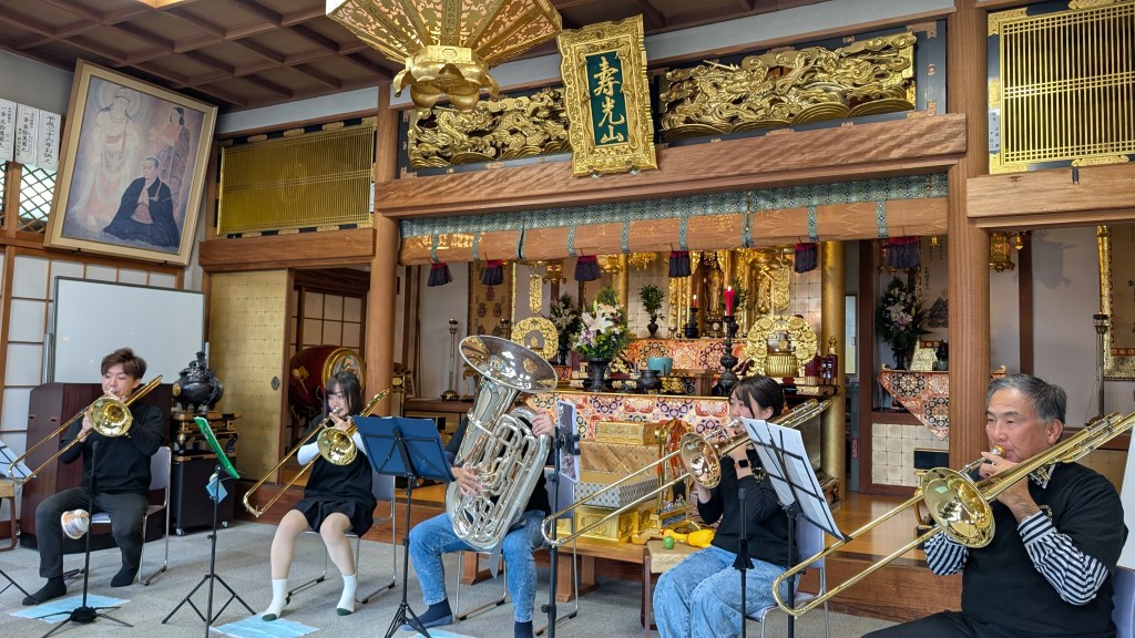 なんか…金ピカのお堂の祭壇を背負って演奏してると、それだけで神々しく見えますね…!アリガタヤアリガタヤ