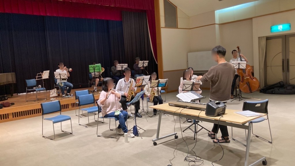 練習曲目1曲目は「愛のあいさつin Swing」。定期演奏会で演奏した「Let’s Swing」の中にもあった曲が含まれているのですが、やはりSwingの曲は苦手の様で、なかなかリズムに乗り切れなかったりで苦戦している人が多いようでした。また、指揮者からは「普通に吹いたのでは中学生の演奏になってしまうから、もっと大人の演奏をしよう。」というアドバイスが出たり、少人数だからこそ気付ける部分もあり、有意義な時間になったのではないでしょうか。奏者が楽しく演奏できないと聴いている人はおもしろくないですからね。
