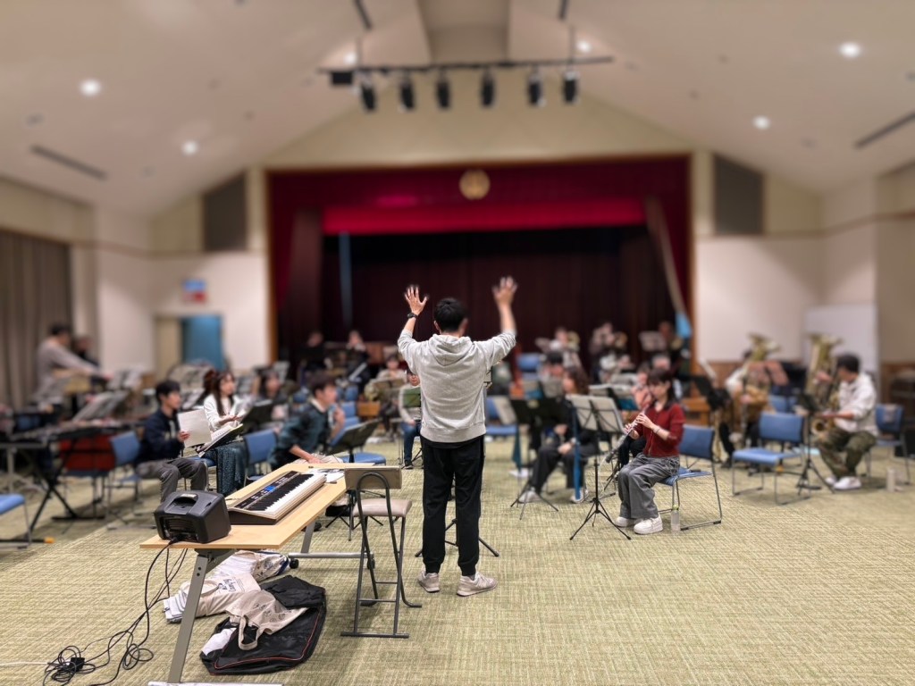 通し練習では、本番と同じように緊張感を持ち、そわそわ。曲の合間にアナウンスも入れたり、ソロは前に出たり、それから忙しく配置替えも。「これで良かったかな?」と確認しながら進めていくのも楽しい過程です♫